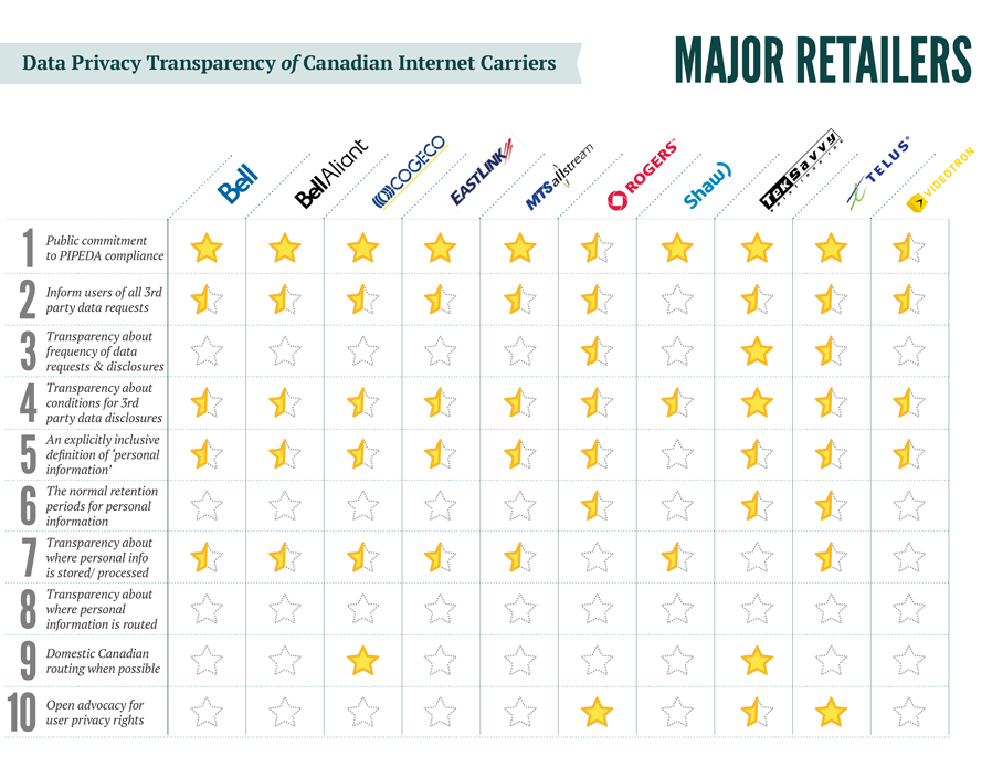 Responding to these concerns, as well as in keeping with the transparency, openness and accountability principles fundamental to Canadian privacy law, this is the second annual report that evaluates the data privacy transparency of the most significant internet carriers serving the Canadian public. We award carriers up to ten ‘stars’ based on the ready public availability of the following information:
